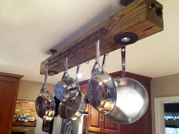Hanging Pot and Pan Rack with a Track Lighting and an Old ... For some time now I've explored removing our two sets of halogen lights in our kitchen and replace them with a hanging pot and pan rack. Ive looked at a bunch of different styles. Some with lights and some without lights. I didn't want to have holes in the ceiling and have to patch holes. I wanted something quick and simple.