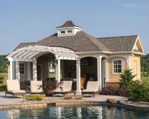 12 Small Outdoor Kitchen Ideas - The Spruce Meghan Beierle-O'Brien / Mark Langos Interior Design This great-looking outdoor pool house kitchen designed by Los Angeles-based Mark Langos Interior Design is what quintessential California living is all about. The corner kitchen has a sink, stove top, oven, and a glass front fridge for beverages. Pool Cabana Design with Outdoor Kitchen - Designing Idea Swimming Pool Cabana Design. The pool cabana measures 17'x25′ in length. The luxury outdoor living space comes equipped with advanced roll down shades, a gas fireplace, outdoor kitchen with grill, and television . The cabana is constructed with a wood frame, with brick & tile walls and a shingle roof. There are a variety of opportunities to ...
