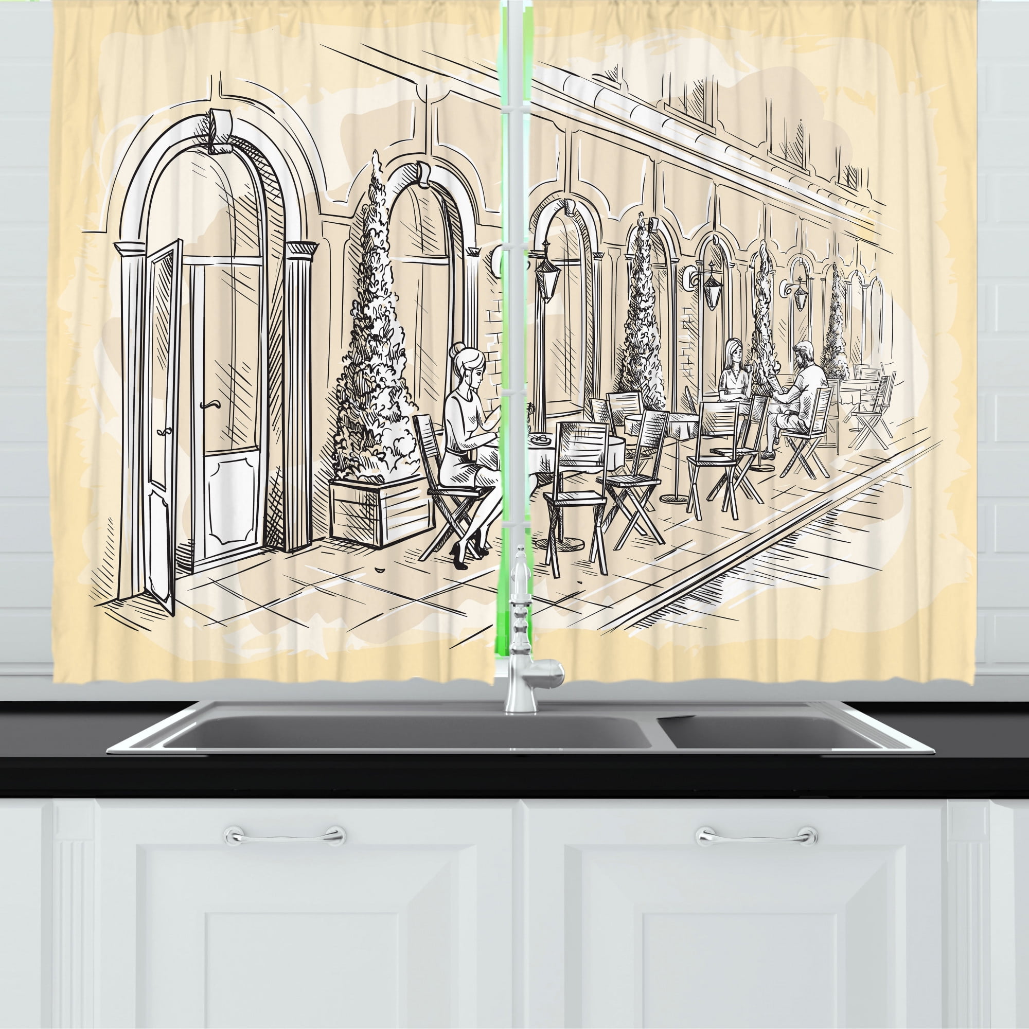 French Cafe Kitchen Curtains, Outline Sketch Illustration Street City Living Traditional Paris Print, Two Panels Drapes with Rod Pocket Room Decor, ...