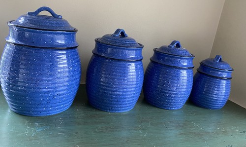 Blue Canister Set of 2 | eBay Blue Canister Set of 2 Ceramic Dutch blue textured finish with glazed inside One is covered container with a handled lid; 5.5" tall, 4" deep, 4.25" diameter The other is a handled pitcher with a spout; 5" deep, 4.5" diameter, 6" wide Made in Portugal by DiLuca Ceramics >Could be used as vases or a large set of cream and sugar containers